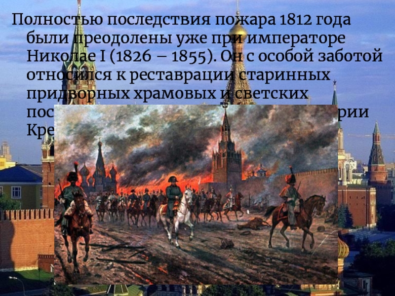 Слайд 16Полностью последствия пожара 1812 года были преодолены уже при императоре Николае