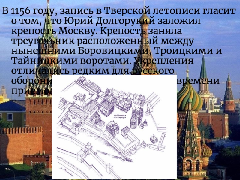 Юрий Долгорукий заложил крепость Москву. Крепость заняла треугольник расположенный между нынешними Боровицкими, Троицкими и Тайницкими воротами. Укрепления отличались редким для русского оборонительного зодчества того времени приемом укрепления стен.