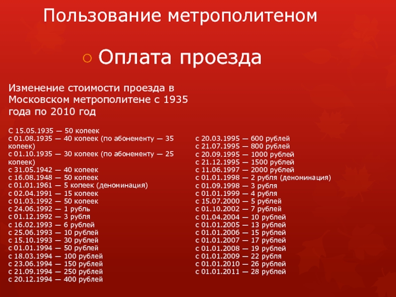 Изменение стоимости проезда в Московском метрополитене с 1935 года по 2010 год