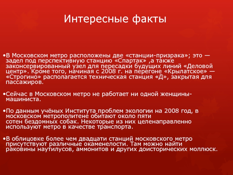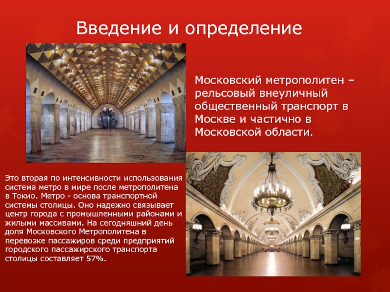 Это вторая по интенсивности использования система метро в мире после метрополитена в Токио. Метро - основа транспортной системы столицы. Оно надежно связывает центр города с промышленными районами и жилыми массивами. На сегодняшний день доля Московского Метрополитена в перевозке пассажиров среди предприятий городского пассажирского транспорта столицы составляет 57%.