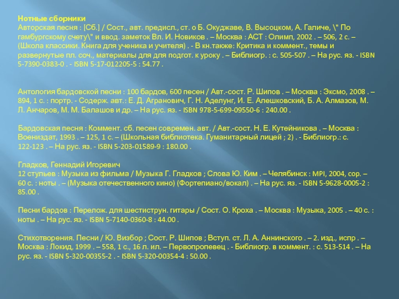 Бардовская песня : Коммент. сб. песен современ. авт. / Авт.-сост. Н. Е. Кутейникова . – Москва : Воениздат, 1993 . – 125, 1 с. – (Школьная библиотека. Гуманитарный лицей ; 2) . - Библиогр.: с. 122-123 . – На рус. яз. - ISBN 5-203-01589-9 : 180.00 .