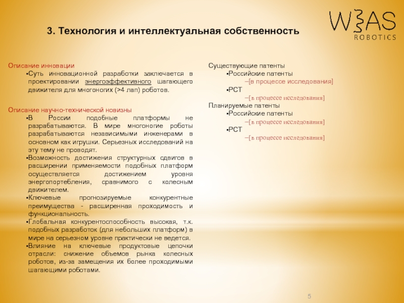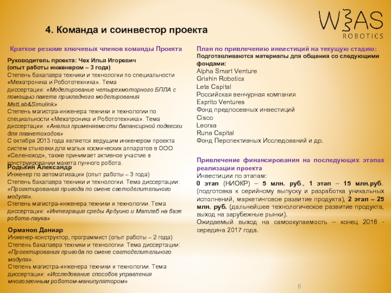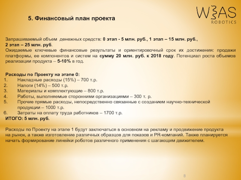 Расходы по Проекту на этапе 1 будут заключаться в основном на рекламу и продвижение продукта на рынок, а также изготовление различных образцов для показов и PR-компаний. Также планируется начать формирование линейки роботов различного применения с шагающим движителем.