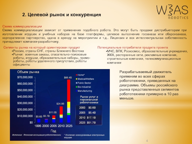 Рынки: военные заказы, спасательно-поисковые роботы, игрушки, образовательные наборы, промо-роботы, роботы удаленного присутствия, роботы официанты