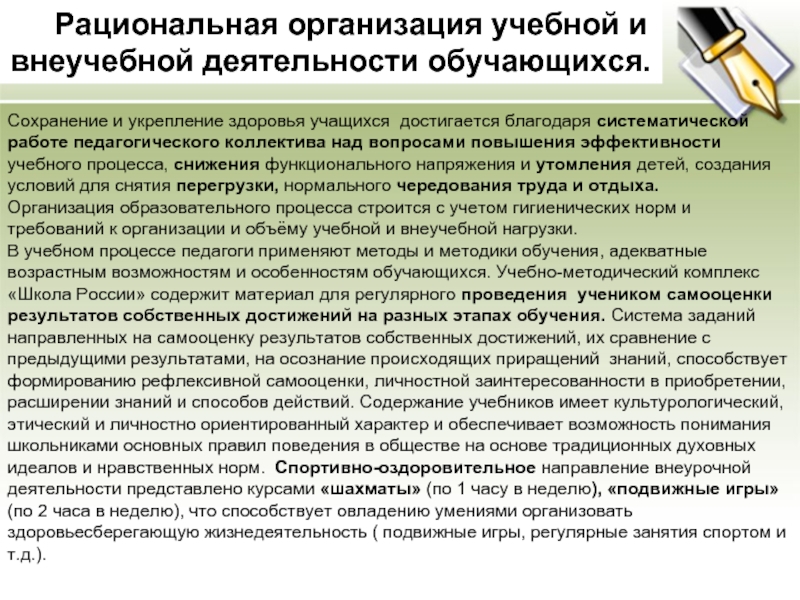 Слайд 16Рациональная организация учебной и внеучебной деятельности обучающихся.