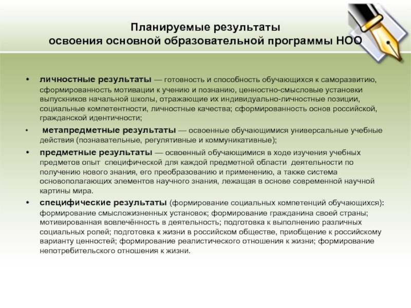 специфические результаты (формирование социальных компетенций обучающихся): формирование смысложизненных установок; формирование гражданина своей страны; мотивированная вовлечённость в деятельность; подготовка к выполнению различных социальных ролей; подготовка к жизни в российском обществе, приобщение к российскому варианту ценностей; формирование реалистического отношения к жизни; формирование непотребительского отношения к жизни.
