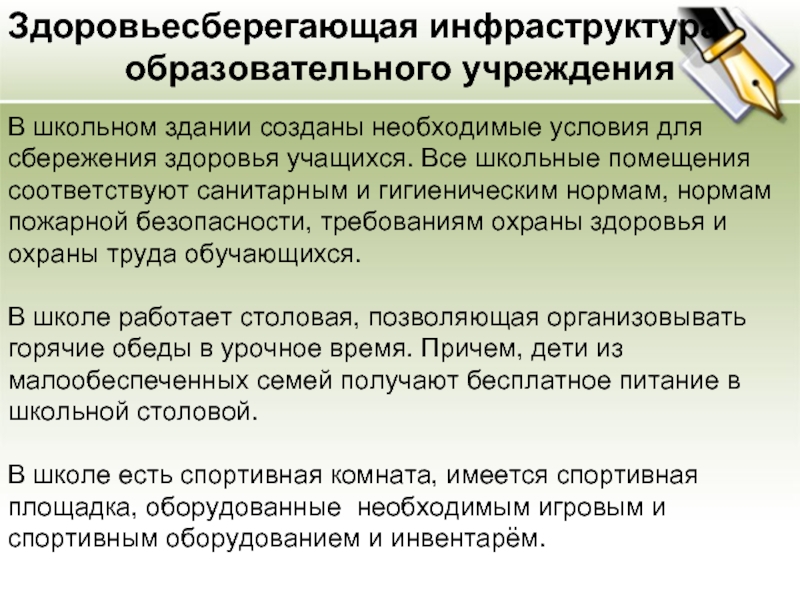 здоровья учащихся. Все школьные помещения соответствуют санитарным и гигиеническим нормам, нормам пожарной безопасности, требованиям охраны здоровья и охраны труда обучающихся.