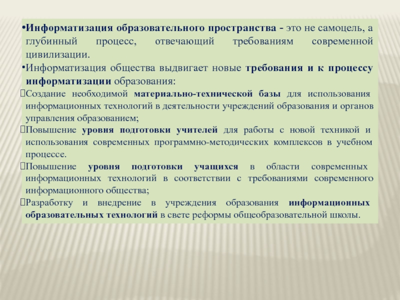 Информатизация общества выдвигает новые требования и к процессу информатизации образования: