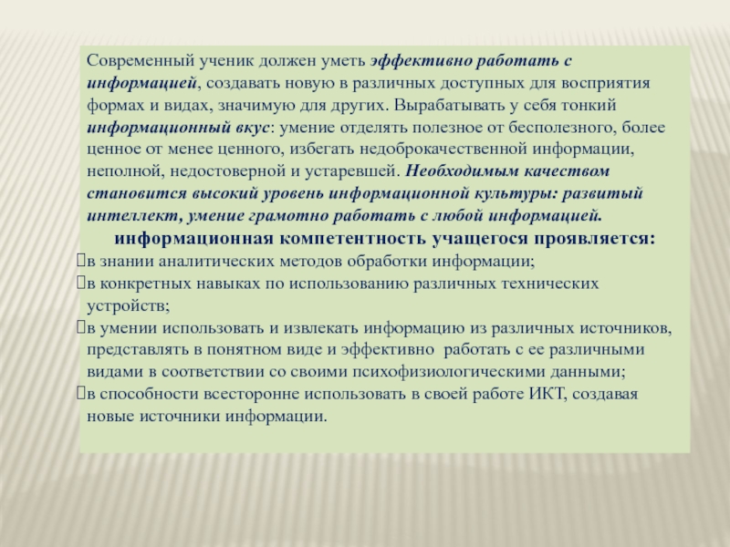 Слайд 41Современный ученик должен уметь эффективно работать с информацией, создавать новую в