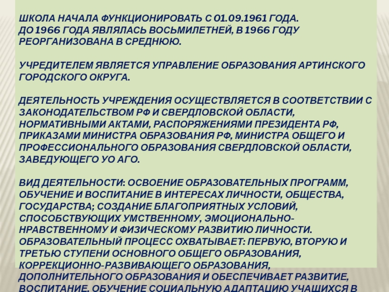 ДЕЯТЕЛЬНОСТЬ УЧРЕЖДЕНИЯ ОСУЩЕСТВЛЯЕТСЯ В СООТВЕТСТВИИ С ЗАКОНОДАТЕЛЬСТВОМ РФ И СВЕРДЛОВСКОЙ ОБЛАСТИ, НОРМАТИВНЫМИ АКТАМИ, РАСПОРЯЖЕНИЯМИ ПРЕЗИДЕНТА РФ, ПРИКАЗАМИ МИНИСТРА ОБРАЗОВАНИЯ РФ, МИНИСТРА ОБЩЕГО И ПРОФЕССИОНАЛЬНОГО ОБРАЗОВАНИЯ СВЕРДЛОВСКОЙ ОБЛАСТИ, ЗАВЕДУЮЩЕГО УО АГО.
