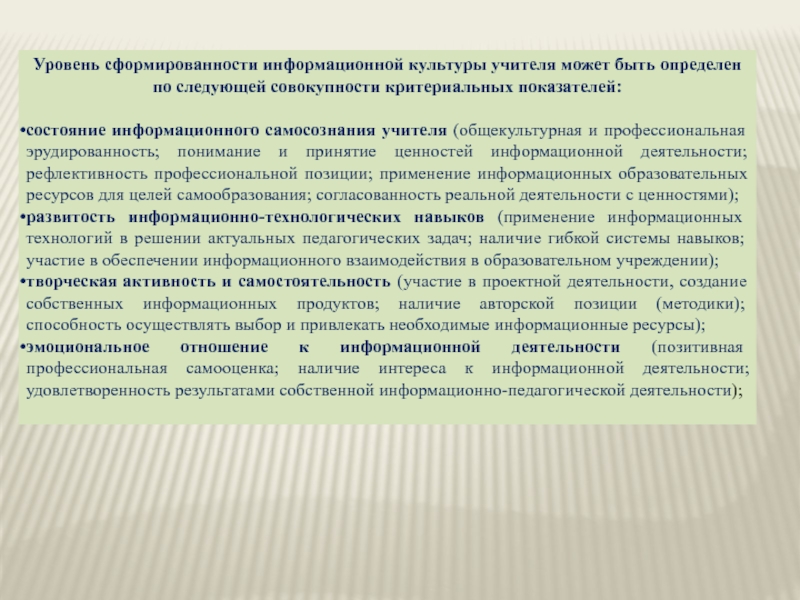 Слайд 40Уровень сформированности информационной культуры учителя может быть определен по следующей совокупности