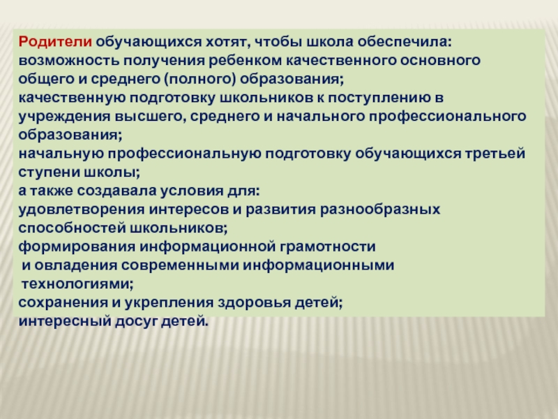 качественную подготовку школьников к поступлению в учреждения высшего, среднего и начального профессионального образования;