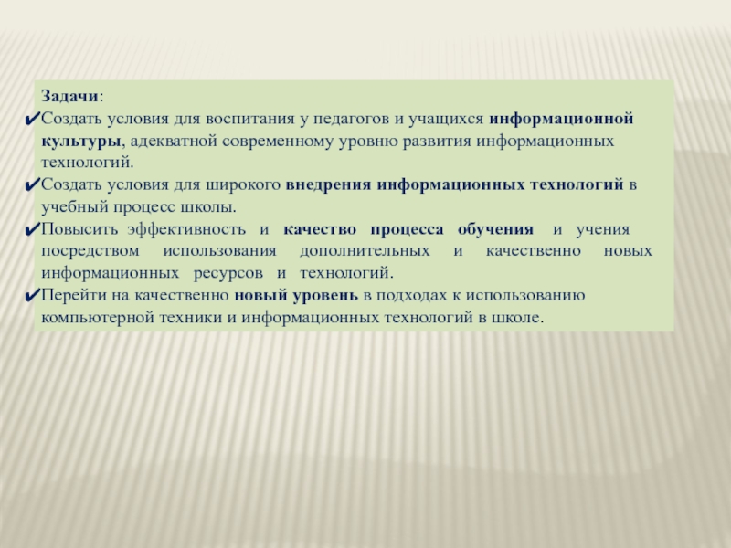 Создать условия для широкого внедрения информационных технологий в учебный процесс школы.