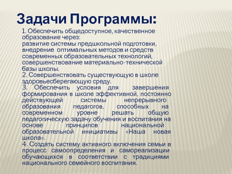3. Обеспечить условия для завершения формирования в школе эффективной, постоянно действующей системы непрерывного образования педагогов, способных на современном уровне решать общую педагогическую задачу обучения и воспитания на основе принципов национальной образовательной инициативы «Наша новая школа».