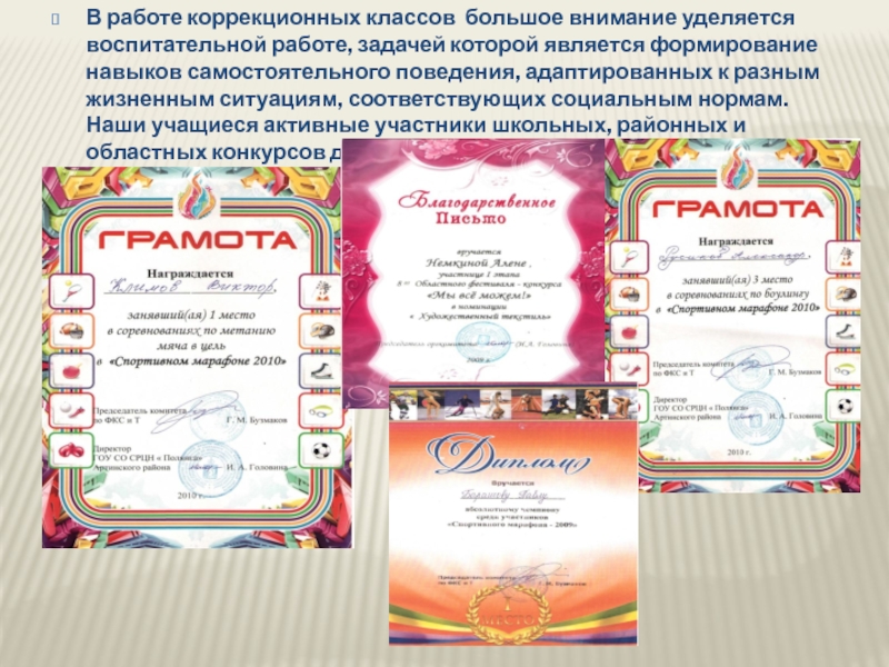 является формирование навыков самостоятельного поведения, адаптированных к разным жизненным ситуациям, соответствующих социальным нормам. Наши учащиеся активные участники школьных, районных и областных конкурсов для де-