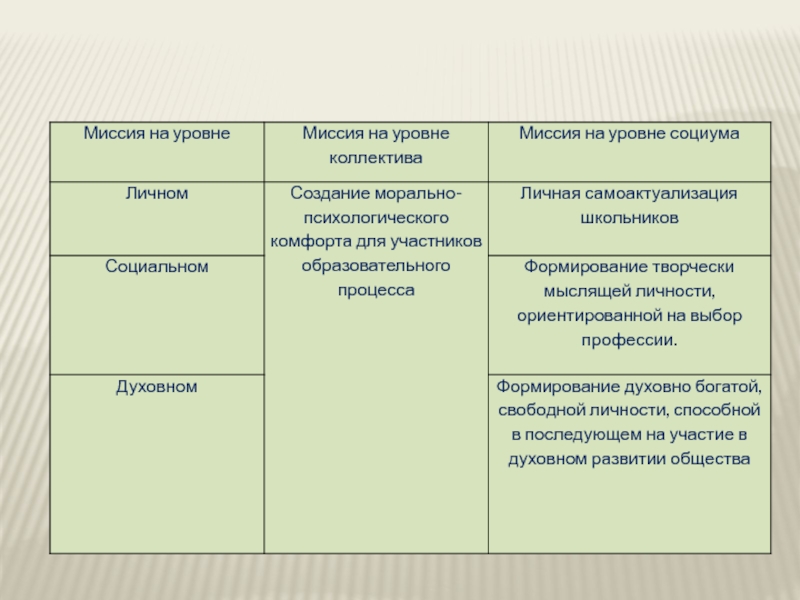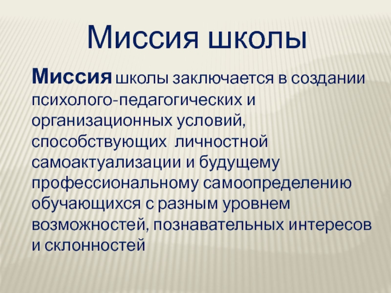 Миссия школы заключается в создании психолого-педагогических и организационных условий, способствующих