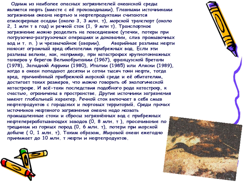 с её производными). Главными источниками загрязнения океана нефтью и нефтепродуктами считаются атмосферные осадки (около 3, 3 млн. т), морской транспорт (около 2, 1 млн т в год) и речной сток (1, 9 млн т). Транспортное загрязнение можно разделить на повседневное (утечки, потери при погрузочно–разгрузочных операциях и доковании, слив промывочных вод и т. п. ) и чрезвычайное (аварии). Аварийные разливы нефти наносят огромный вред обитателям прибрежных вод. Если эти разливы велики, как, например, при катастрофах крупнотоннажных танкеров у берегов Великобритании (1967), французской Бретани (1978), Западной Африки (1980), Италии (1985) или Аляски (1989), когда в океан попадают десятки и сотни тысяч тонн нефти, тогда вред, причинённый прибрежной морской среде и её обитателям, достигает таких размеров, что можно говорить об экологической катастрофе. И всё-таки последствия подобного рода катастроф, к счастью, ограничены в пространстве. Другие источники загрязнения имеют глобальный характер. Речной сток включает в себя смыв нефтепродуктов с городских и портовых территорий. Среди прочих источников нефтяного загрязнения океана надо назвать промышленные стоки и сбросы загрязнённых вод с прибрежных нефтеперерабатывающих заводов (0, 8 млн. т ), просачивание по трещинам из горных пород (0, 6 млн. т), потери при морской добыче ( 0, 1 млн. т). Таким образом, Мировой океан ежегодно принимает до 10 млн. т нефти и нефтепродуктов.