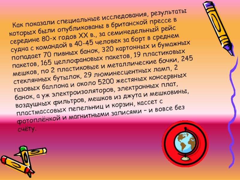 прессе в середине 80-х годов ХХ в., за семинедельный рейс судна с командой в 40-45 человек за борт в среднем попадает 70 пивных банок, 320 картонных и бумажных пакетов, 165 целлофановых пакетов, 19 пластиковых мешков, по 2 пластиковые и металлические бочки, 245 стеклянных бутылок, 29 люминесцентных ламп, 2 газовых баллона и около 5200 жестяных консервных банок, а уж электроизоляторов, электронных плат, воздушных фильтров, мешков из джута и мешковины, пластмассовых пепельниц и корзин, кассет с фотоплёнкой и магнитными записями – и вовсе без счёту.