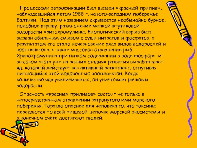 Слайд 13 Процессами эвтрофикации был вызван «красный прилив», наблюдавшийся летом 1988 г.