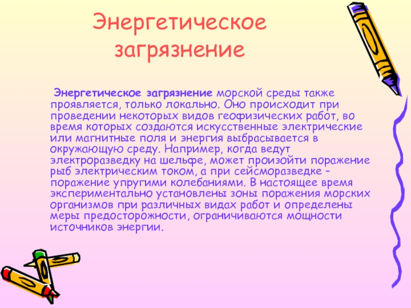 Энергетическое загрязнение морской среды также проявляется, только локально.