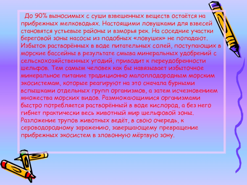 Слайд 10 До 90% выносимых с суши взвешенных веществ остаётся на прибрежных