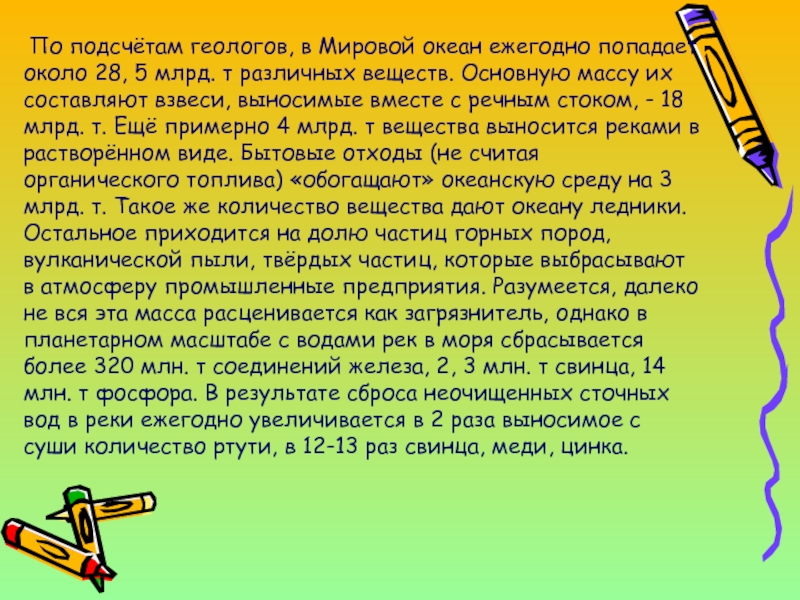 Слайд 9 По подсчётам геологов, в Мировой океан ежегодно попадает около 28,