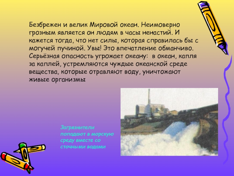 часы ненастий. И кажется тогда, что нет силы, которая справилась бы с могучей пучиной. Увы! Это впечатление обманчиво. Серьёзная опасность угрожает океану: в океан, капля за каплей, устремляются чуждые океанской среде вещества, которые отравляют воду, уничтожают живые организмы