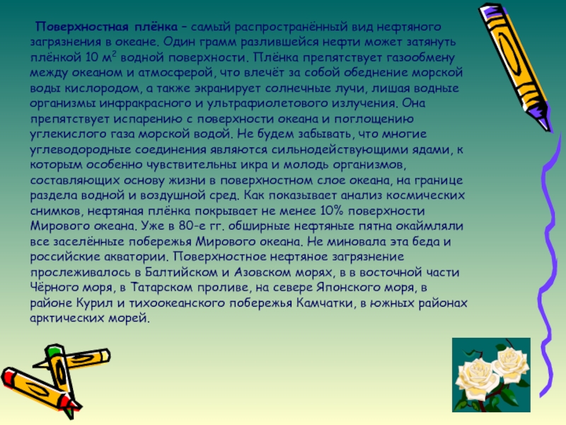 Один грамм разлившейся нефти может затянуть плёнкой 10 м2 водной поверхности. Плёнка препятствует газообмену между океаном и атмосферой, что влечёт за собой обеднение морской воды кислородом, а также экранирует солнечные лучи, лишая водные организмы инфракрасного и ультрафиолетового излучения. Она препятствует испарению с поверхности океана и поглощению углекислого газа морской водой. Не будем забывать, что многие углеводородные соединения являются сильнодействующими ядами, к которым особенно чувствительны икра и молодь организмов, составляющих основу жизни в поверхностном слое океана, на границе раздела водной и воздушной сред. Как показывает анализ космических снимков, нефтяная плёнка покрывает не менее 10% поверхности Мирового океана. Уже в 80-е гг. обширные нефтяные пятна окаймляли все заселённые побережья Мирового океана. Не миновала эта беда и российские акватории. Поверхностное нефтяное загрязнение прослеживалось в Балтийском и Азовском морях, в в восточной части Чёрного моря, в Татарском проливе, на севере Японского моря, в районе Курил и тихоокеанского побережья Камчатки, в южных районах арктических морей.