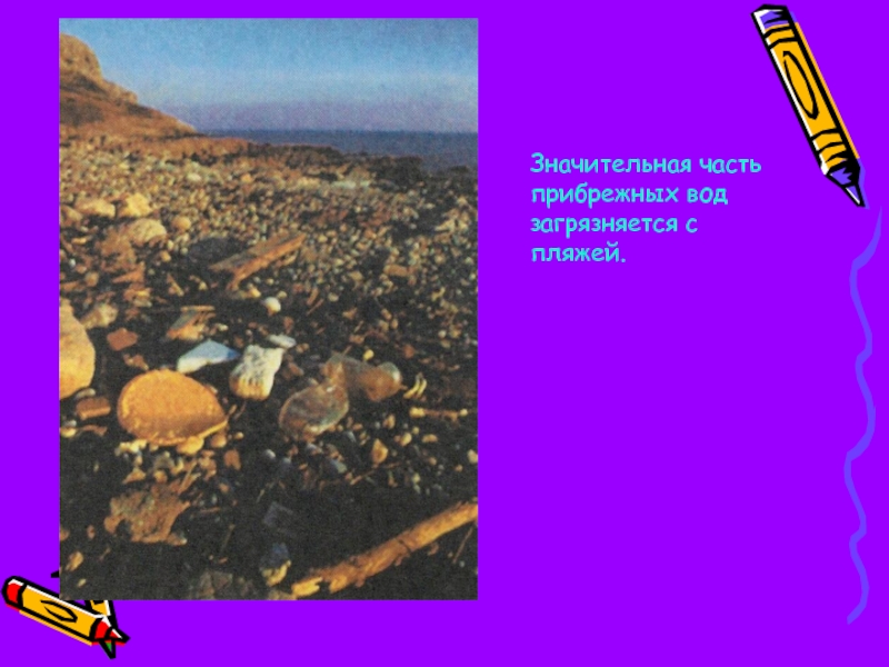 Слайд 11Значительная часть прибрежных вод загрязняется с пляжей.