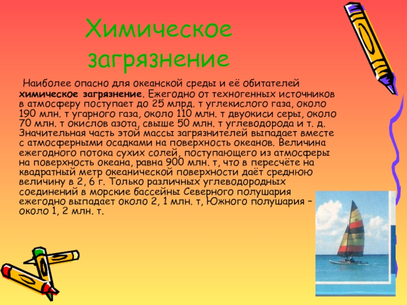 химическое загрязнение. Ежегодно от техногенных источников в атмосферу поступает до 25 млрд. т углекислого газа, около 190 млн. т угарного газа, около 110 млн. т двуокиси серы, около 70 млн. т окислов азота, свыше 50 млн. т углеводорода и т. д. Значительная часть этой массы загрязнителей выпадает вместе с атмосферными осадками на поверхность океанов. Величина ежегодного потока сухих солей, поступающего из атмосферы на поверхность океана, равна 900 млн. т, что в пересчёте на квадратный метр океанической поверхности даёт среднюю величину в 2, 6 г. Только различных углеводородных соединений в морские бассейны Северного полушария ежегодно выпадает около 2, 1 млн. т, Южного полушария – около 1, 2 млн. т.