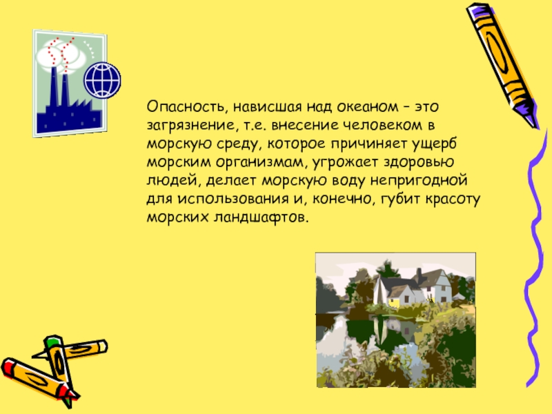 Слайд 3Опасность, нависшая над океаном – это загрязнение, т.е. внесение человеком в