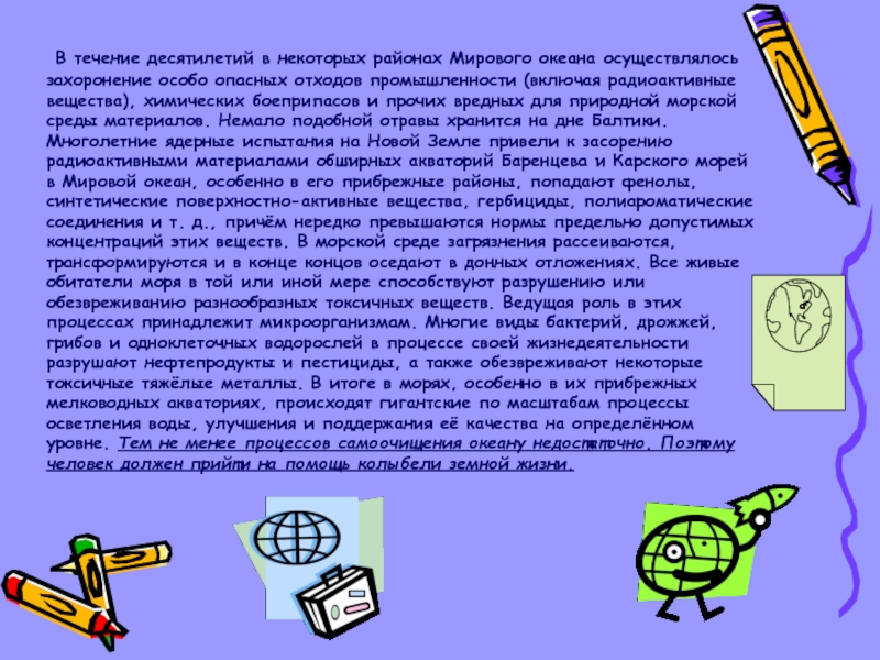 особо опасных отходов промышленности (включая радиоактивные вещества), химических боеприпасов и прочих вредных для природной морской среды материалов. Немало подобной отравы хранится на дне Балтики. Многолетние ядерные испытания на Новой Земле привели к засорению радиоактивными материалами обширных акваторий Баренцева и Карского морей в Мировой океан, особенно в его прибрежные районы, попадают фенолы, синтетические поверхностно-активные вещества, гербициды, полиароматические соединения и т. д., причём нередко превышаются нормы предельно допустимых концентраций этих веществ. В морской среде загрязнения рассеиваются, трансформируются и в конце концов оседают в донных отложениях. Все живые обитатели моря в той или иной мере способствуют разрушению или обезвреживанию разнообразных токсичных веществ. Ведущая роль в этих процессах принадлежит микроорганизмам. Многие виды бактерий, дрожжей, грибов и одноклеточных водорослей в процессе своей жизнедеятельности разрушают нефтепродукты и пестициды, а также обезвреживают некоторые токсичные тяжёлые металлы. В итоге в морях, особенно в их прибрежных мелководных акваториях, происходят гигантские по масштабам процессы осветления воды, улучшения и поддержания её качества на определённом уровне. Тем не менее процессов самоочищения океану недостаточно. Поэтому человек должен прийти на помощь колыбели земной жизни.