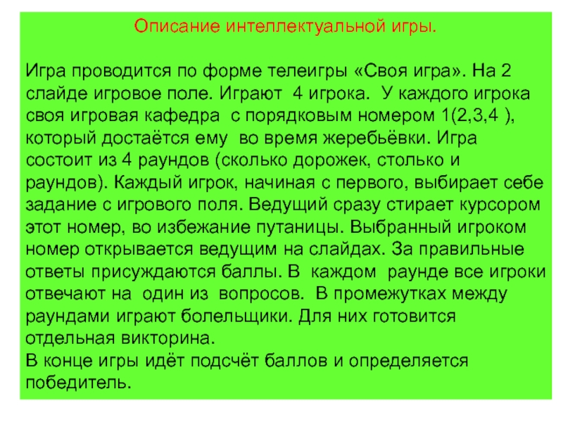 слайде игровое поле. Играют 4 игрока. У каждого игрока своя игровая кафедра с порядковым номером 1(2,3,4 ), который достаётся ему во время жеребьёвки. Игра состоит из 4 раундов (сколько дорожек, столько и раундов). Каждый игрок, начиная с первого, выбирает себе задание с игрового поля. Ведущий сразу стирает курсором этот номер, во избежание путаницы. Выбранный игроком номер открывается ведущим на слайдах. За правильные ответы присуждаются баллы. В каждом раунде все игроки отвечают на один из вопросов. В промежутках между раундами играют болельщики. Для них готовится отдельная викторина.