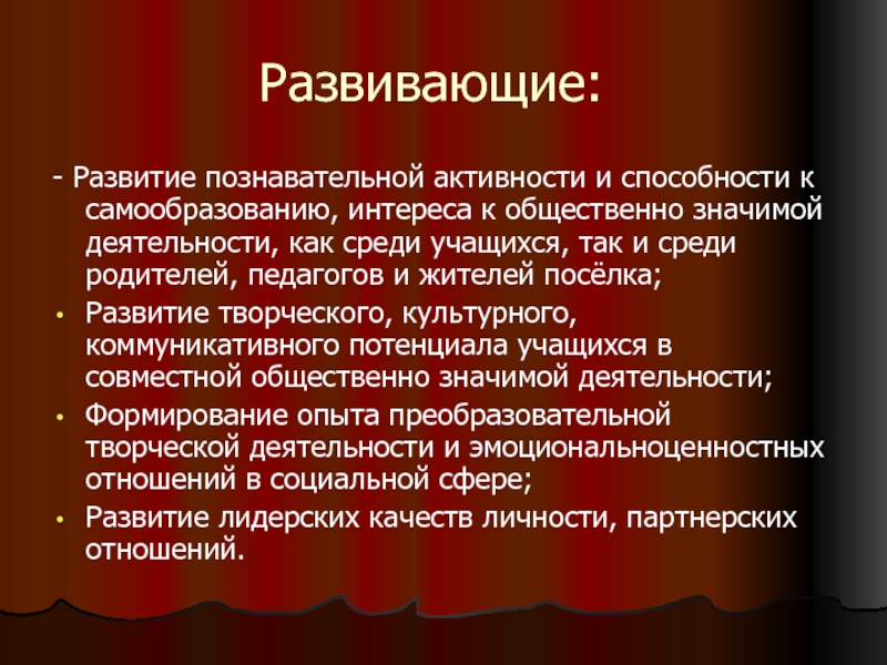 Развитие творческого, культурного, коммуникативного потенциала учащихся в совместной общественно значимой деятельности;