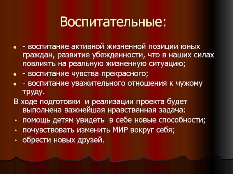 В ходе подготовки и реализации проекта будет выполнена важнейшая нравственная задача: