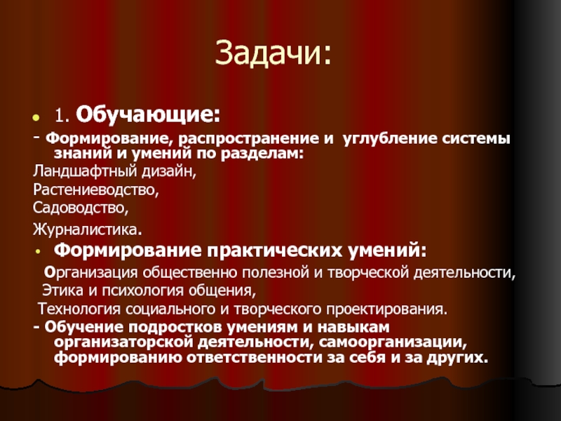 - Обучение подростков умениям и навыкам организаторской деятельности, самоорганизации, формированию ответственности за себя и за других.