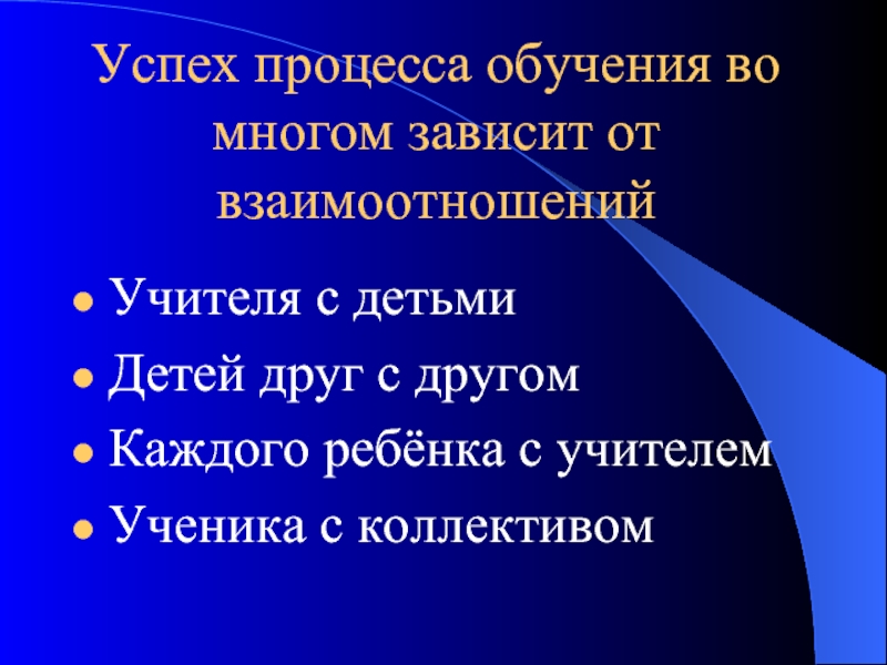 Слайд 4Успех процесса обучения во многом зависит от взаимоотношений