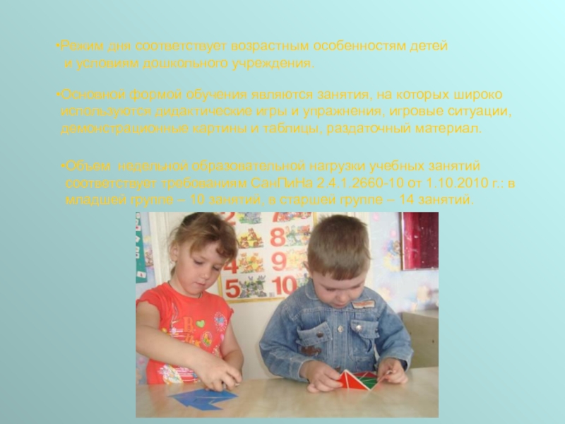 Объем недельной образовательной нагрузки учебных занятий соответствует требованиям СанПиНа 2.4.1.2660-10 от 1.10.2010 г.: в младшей группе – 10 занятий, в старшей группе – 14 занятий.