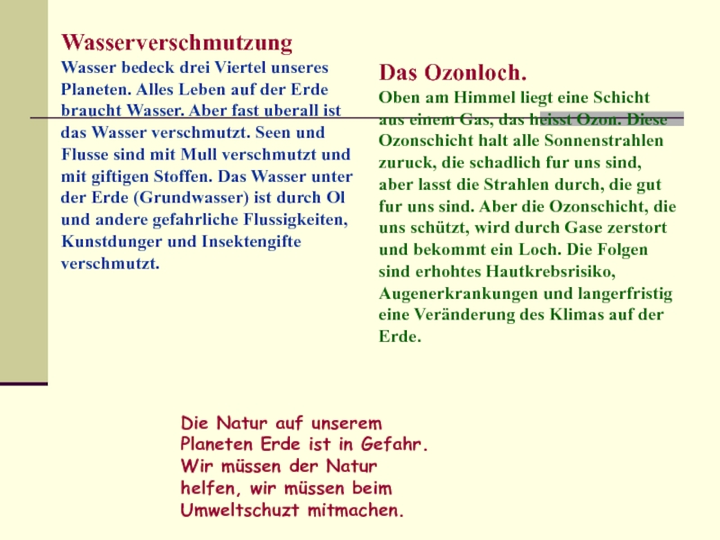 Oben am Himmel liegt eine Schicht aus einem Gas, das heisst Ozon. Diese Ozonschicht halt alle Sonnenstrahlen zuruck, die schadlich fur uns sind, aber lasst die Strahlen durch, die gut fur uns sind. Aber die Ozonschicht, die uns schützt, wird durch Gase zerstort und bekommt ein Loch. Die Folgen sind erhohtes Hautkrebsrisiko, Augenerkrankungen und langerfristig eine Veränderung des Klimas auf der Erde.