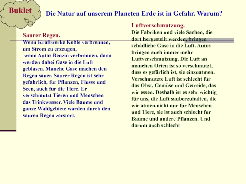 Die Fabriken und viele Sachen, die dort hergestellt werden, bringen schädliche Gase in die Luft. Autos bringen auch immer mehr Luftverschmutzung. Die Luft an manchen Orten ist so verschmutzt, dass es gefärlich ist, sie einzuatmen. Verschmutzte Luft ist schlecht für das Obst, Gemüse und Getreide, das wir essen. Deshalb ist es sehr wichtig für uns, die Luft sauberzuhalten, die wir atmen.nicht nur für Menschen und Tiere, sie ist auch schlecht fur Baume und andere Pflanzen. Und darum auch schlecht