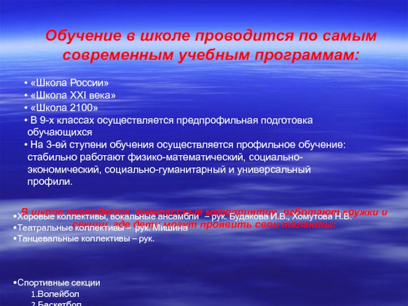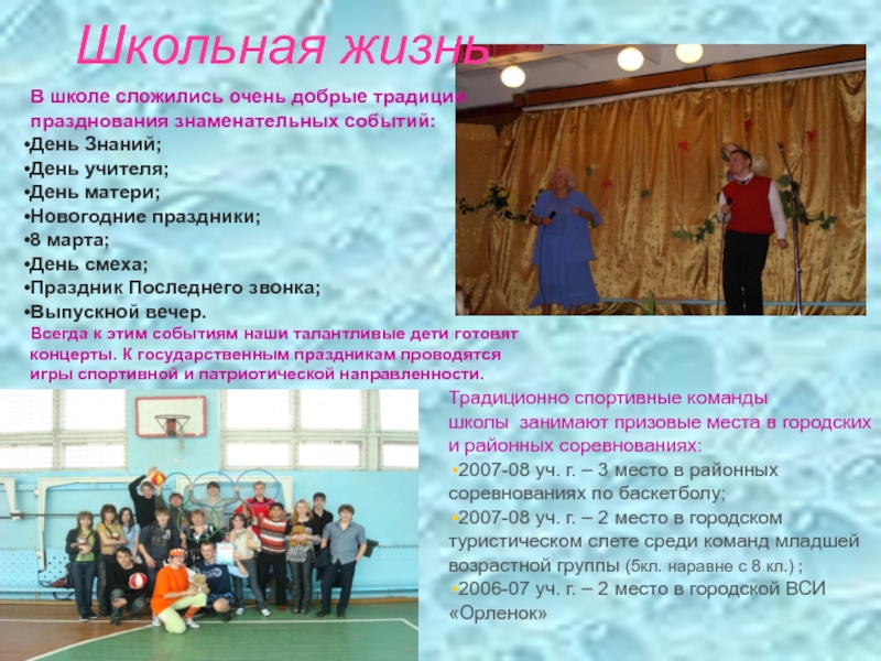 В школе проводятся внеклассные мероприятия, работают кружки и секции, где дети могут проявить свои таланты: