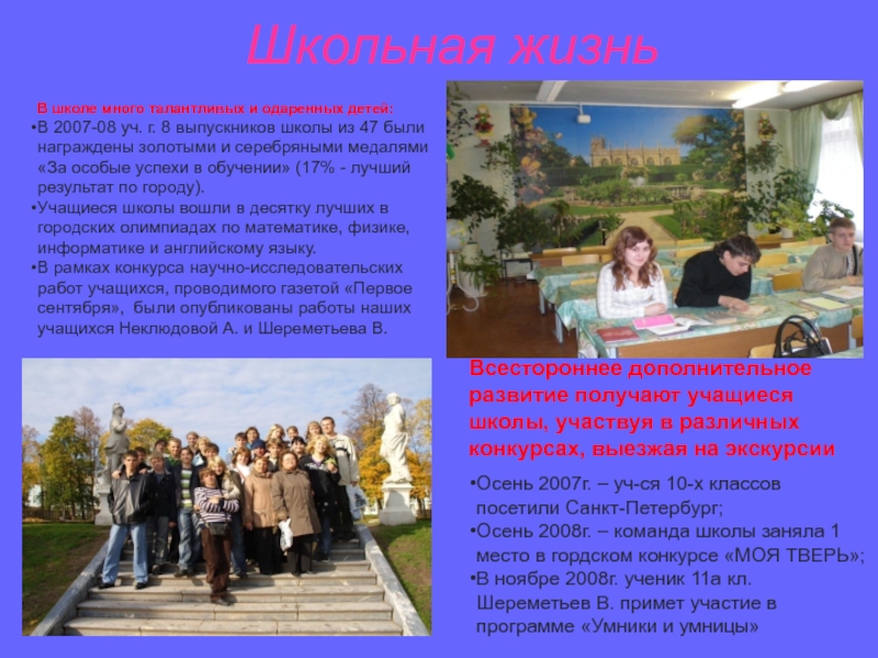 Всестороннее дополнительное развитие получают учащиеся школы, участвуя в различных конкурсах, выезжая на экскурсии