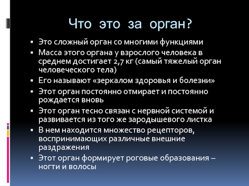 Этот орган формирует роговые образования – ногти и волосы