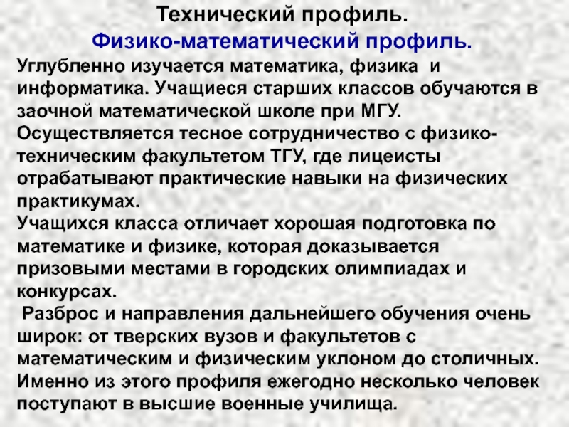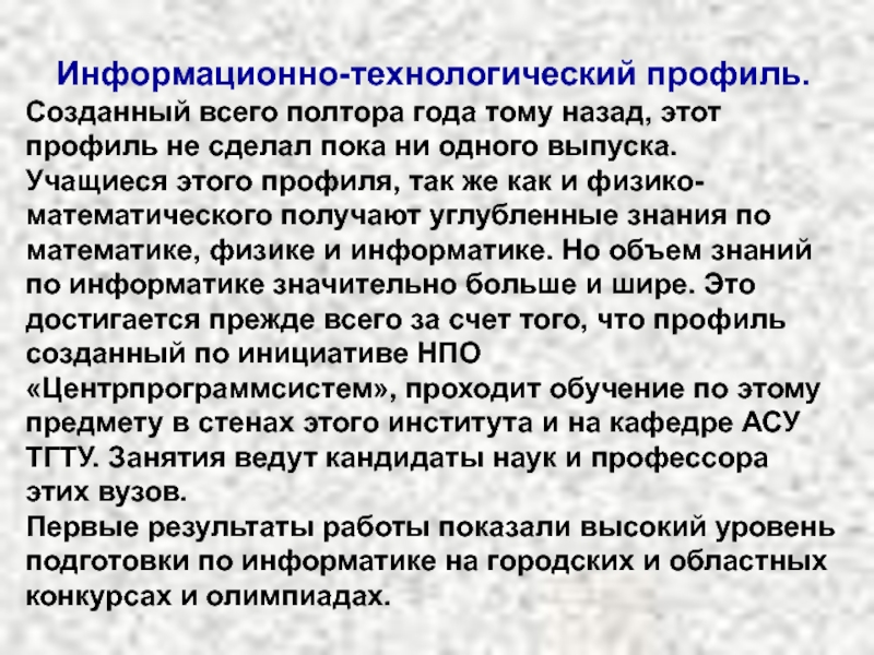 Учащиеся этого профиля, так же как и физико-математического получают углубленные знания по математике, физике и информатике. Но объем знаний по информатике значительно больше и шире. Это достигается прежде всего за счет того, что профиль созданный по инициативе НПО «Центрпрограммсистем», проходит обучение по этому предмету в стенах этого института и на кафедре АСУ ТГТУ. Занятия ведут кандидаты наук и профессора этих вузов.