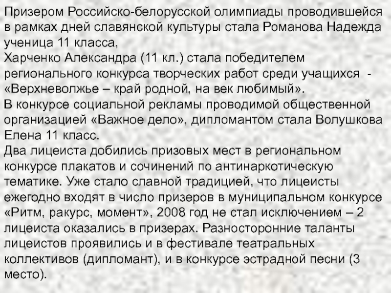 Слайд 12Призером Российско-белорусской олимпиады проводившейся в рамках дней славянской культуры стала Романова