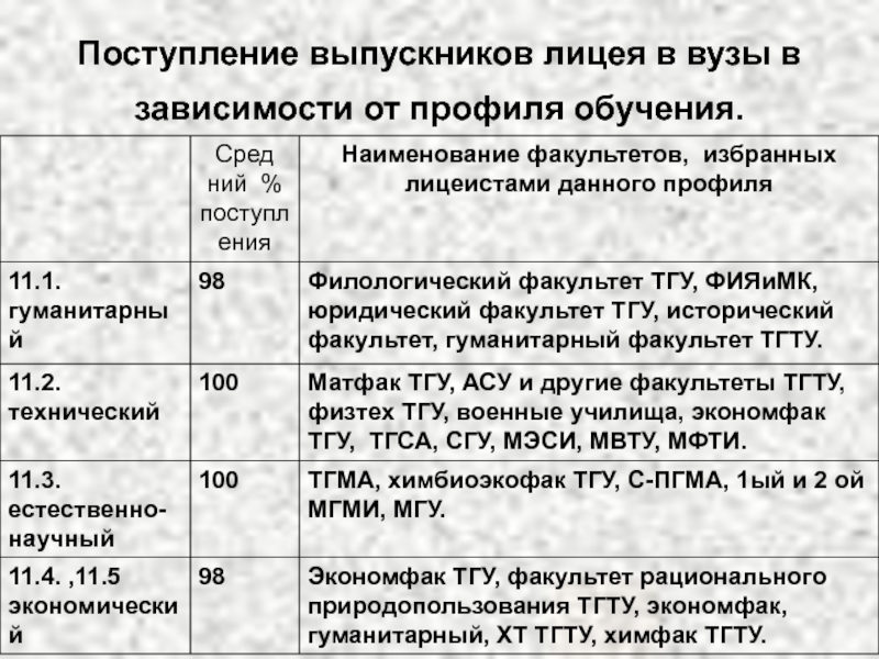 Основная масса учащихся поступает на экономический факультет ТГУ и ТГТУ, а так же в другие вузы обучающие по экономическим специальностям. Большой интерес проявляют выпускники данного профиля к вузам дающим специальности социальной направленности.