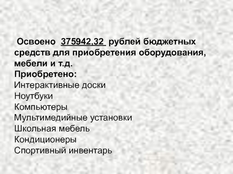 Слайд 21 Освоено 375942,32 рублей бюджетных средств для приобретения оборудования, мебели и