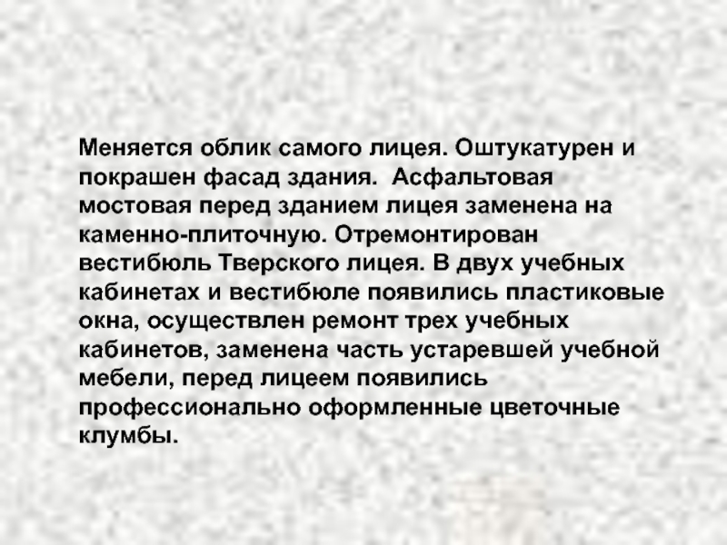 Слайд 16Меняется облик самого лицея. Оштукатурен и покрашен фасад здания. Асфальтовая мостовая
