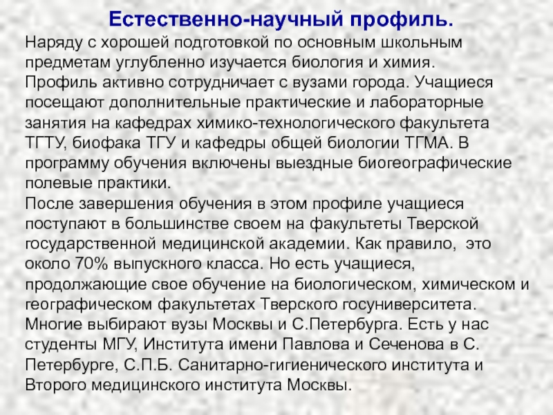 После завершения обучения в этом профиле учащиеся поступают в большинстве своем на факультеты Тверской государственной медицинской академии. Как правило, это около 70% выпускного класса. Но есть учащиеся, продолжающие свое обучение на биологическом, химическом и географическом факультетах Тверского госуниверситета. Многие выбирают вузы Москвы и С.Петербурга. Есть у нас студенты МГУ, Института имени Павлова и Сеченова в С.Петербурге, С.П.Б. Санитарно-гигиенического института и Второго медицинского института Москвы.