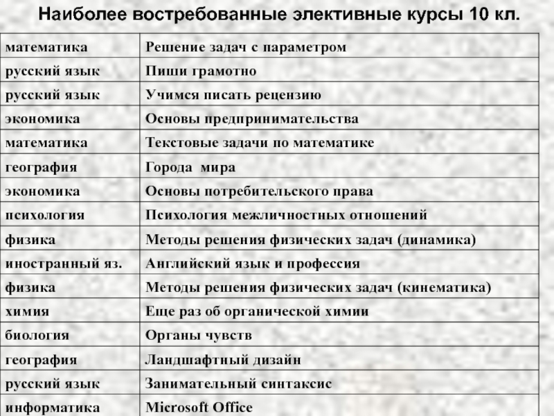 Слайд 51Наиболее востребованные элективные курсы 10 кл.