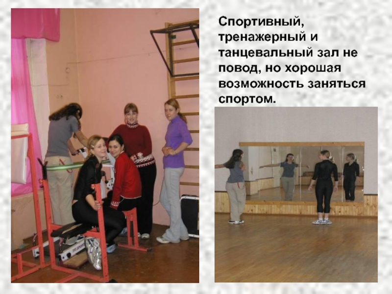 Слайд 25Спортивный, тренажерный и танцевальный зал не повод, но хорошая возможность заняться